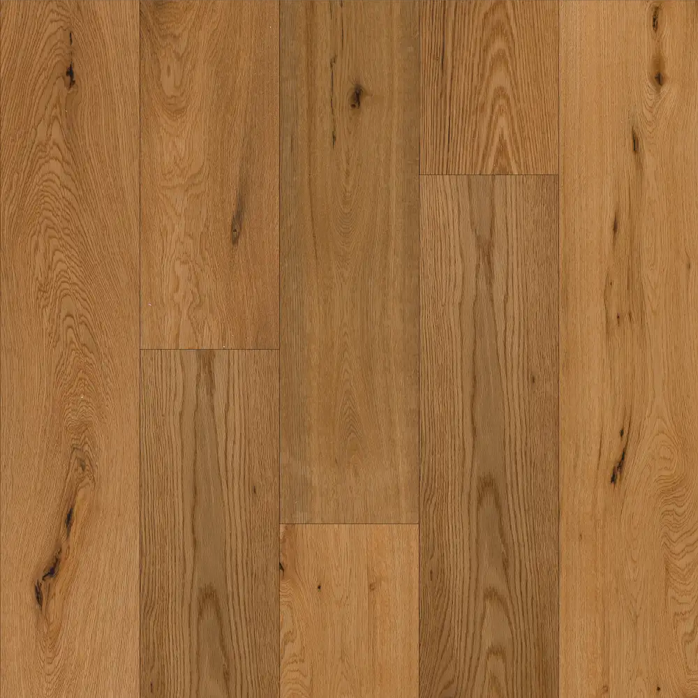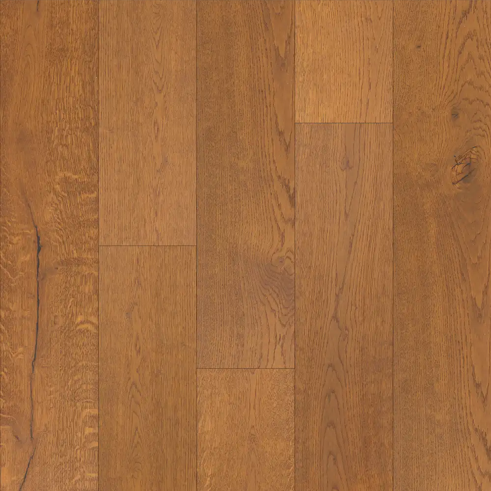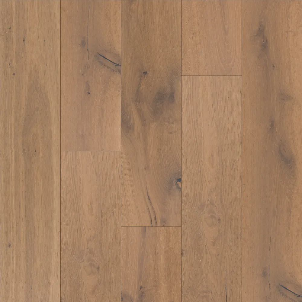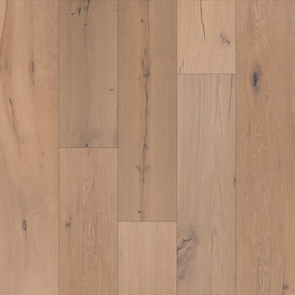 Longwood Vintage is a prefinished 3-ply, 4-sided beveled wood floor. Repainted with 5 coats of 10% gloss acrylic varnish and finished with medium brushing. It features a noble top layer of oak, a middle layer and a bottom layer of poplar. Cut staves are possible up to 25% of the content of each package.