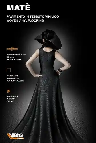 Matè un pavimento costituito da uno strato superficiale vinilico effetto stuoia supportato, composto da una mescolanza omogenea di resine viniliche, plastificanti, stabilizzanti, additivi inorganici e cariche minerali inerti. Lo strato superficiale d’usura è composto al 97% da cloruro di polivinile, al 2% da poliestere e all’1% fibra di vetro.